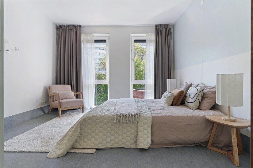 De aparte slaapkamer biedt voldoende ruimte voor een comfortabel bed en kastruimte. De woning is praktisch ingericht, met brede doorgangen en een logische indeling die geschikt is voor bewoners met een zorgbehoefte.