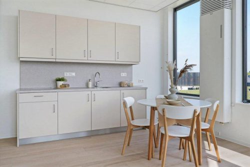 De woonkamer met open keuken vormt het hart van het appartement. De keuken is praktisch opgesteld en uitgerust met de benodigde voorzieningen. De ruimte biedt volop mogelijkheden voor een comfortabele zit- en eethoek en geniet van een prettige lichtinval.