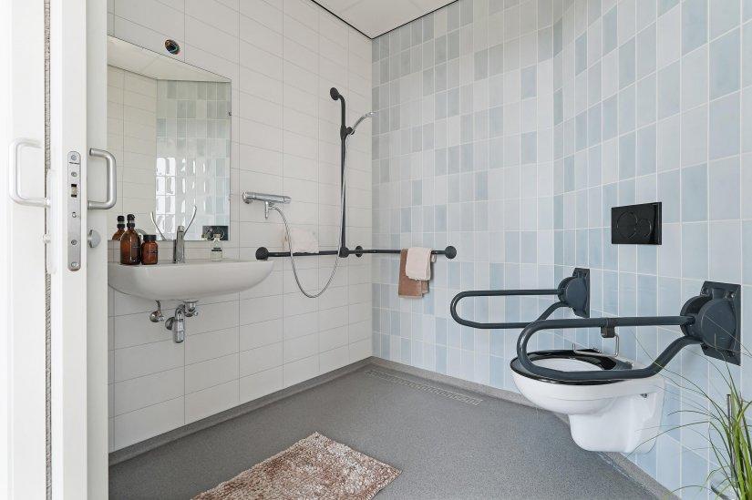 De badkamer is functioneel ingericht en voorzien van een douche en wastafel, met voldoende ruimte voor zorgondersteuning indien nodig.