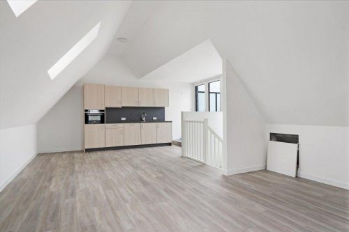 Op de bovenste verdieping bevindt zich de lichte woonkamer met een open keuken en directe toegang tot het terras, ideaal om van het buitenleven te genieten.